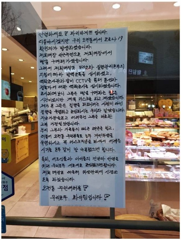 빵집 주인이 주민들께 보내는 대자보를 걸었네요.