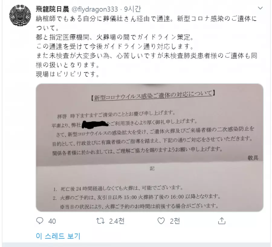 일본 장의사, 고로나19 사망자 대처 가이드라인 폭로