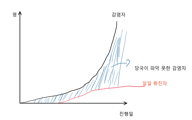 감염자가 어느 정도 생기기 시작하면 방역 당국도 이를 인지하고 감염자를 찾아 확진하게 됩니다. 그런데 이 시기가 늦어지면 이미 감염자가 폭증한 상태라 손을 쓸 수 없게됩니다. 또 일찍 찾았더라도 확진자를 찾는 속도가 너무 늦으면 마찬가지로 손을 쓸 수 없는 상황에 빠지게 되죠.